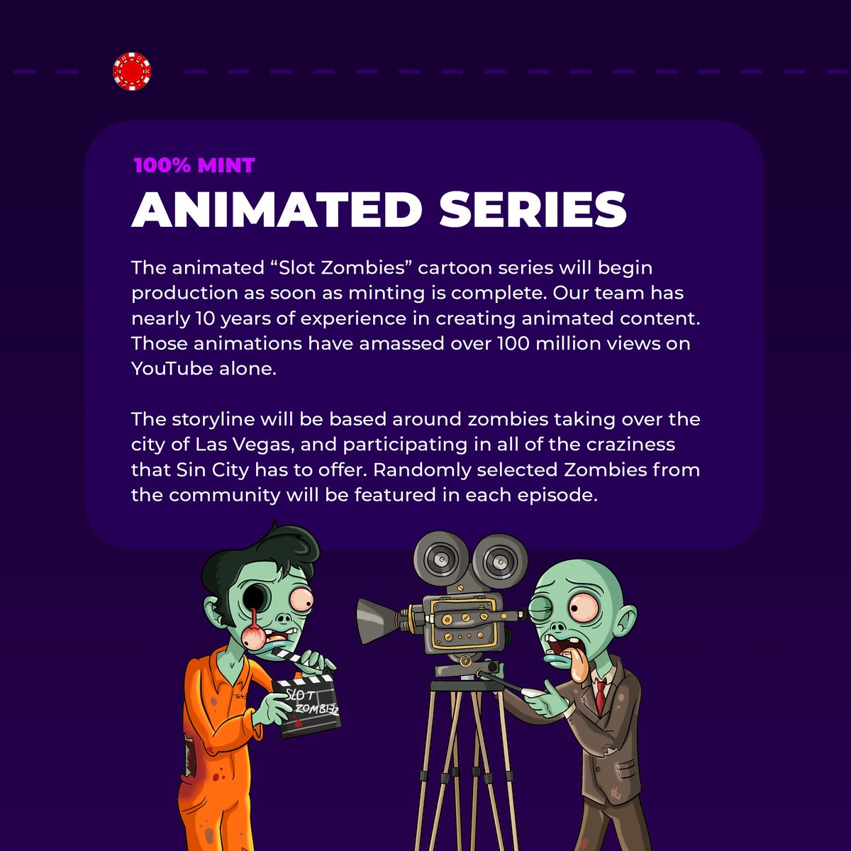 THE SLOT ZOMBIES ROADMAP - Give back to holders in the way of free-to-play casino games. Starting with Beeple who is now regarded as one of the most richest artist in the world because of NFTs. Take a spin of our mint machine and claim one of 7777 unique brain-eating Slot Zombies then start your unforgettable Sin City adventure.