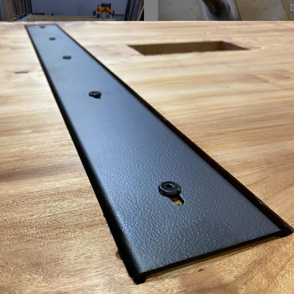 It gets inlayed into the wood using a router. The production line is made of decoiler automatic punc. Laser cut out of 316 steel sandblasted and powder coated in a black wrinkle texture finish.